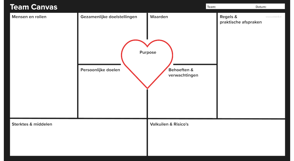 Bij VolleKR8 gebruiken we het Teamcanvas als startpunt om teams in beweging te brengen. Het geeft structuur, maar ook ruimte om echt met elkaar in gesprek te gaan. Zo worden teams niet alleen effectiever, maar ervaren ze ook meer plezier, eigenaarschap en onderlinge verbondenheid.